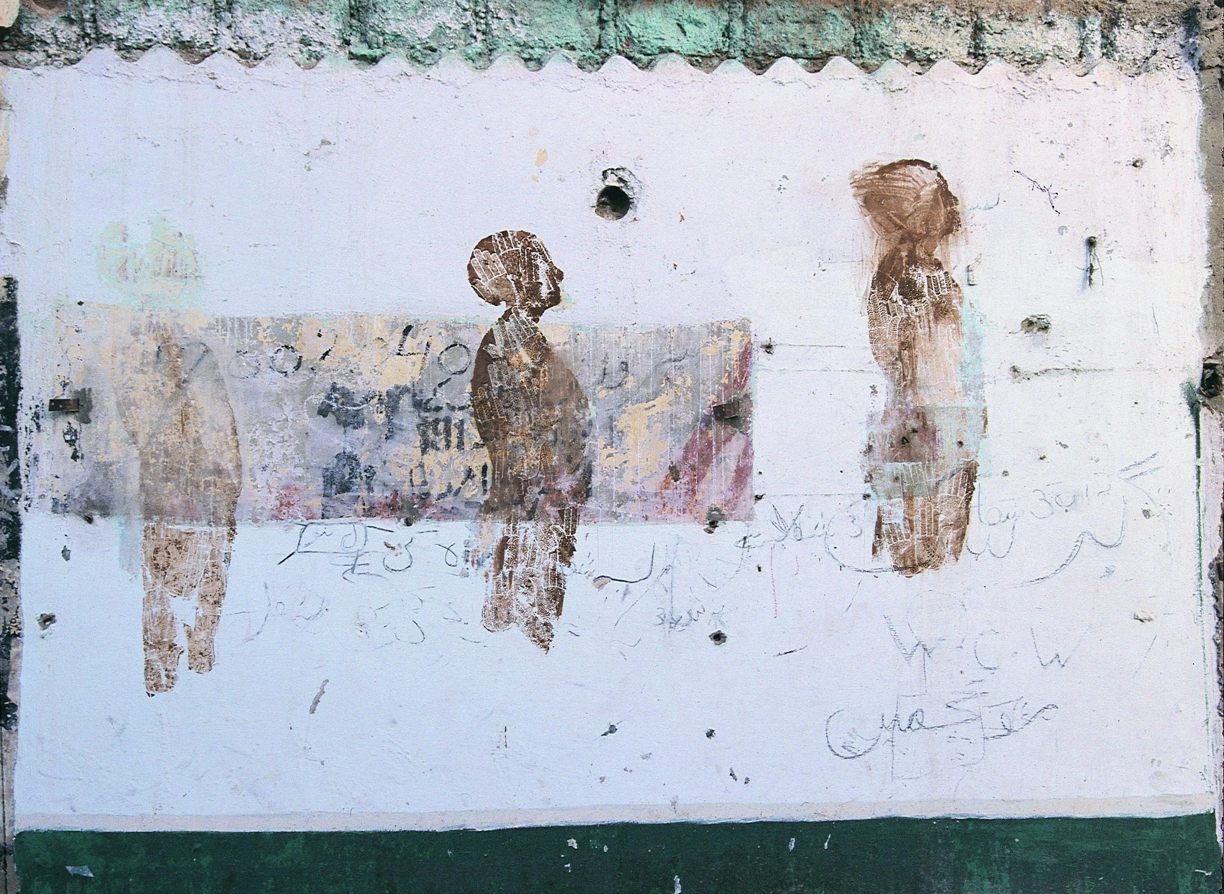 In the original project, Khan draws silhouettes of the female figure, by using stencil designs of henna patterns with henna pigment applied directly to the walls near the Cantonment Railway Station, Karachi. Khan’s figures are fleeting and transient presences, even before they are fully overlaid by new traces of graffiti and political writing on the walls.